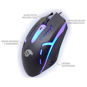 Mouse óptico de 03 botões + scroll.Sensibilidade de 800 - 1200 - 1600 DPI.LEDs com mudança automática nas cores: vermelho, verde, azul e roxo.Design ergonômico e confortável.Cabo USB, plug and play.Compatível com os sistemas operacionais: Windows XP/Vista/7/8/10.Mouse preto com detalhes em LED na superfície.
