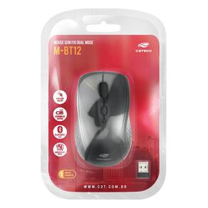 O mouse sem fio C3Tech M-BT12BK oferece conexão dual mode via wireless 2.4ghz e Bluetooth, proporcionando liberdade e conforto para longas horas de uso. Com ajuste de até 1600 DPI, é ideal para tarefas diárias e ambientes de trabalho. Possui seis botões que facilitam a navegação e produtividade. O design ergonômico oferece conforto para o uso contínuo, com instalação plug and play para fácil configuração. Especificações Gerais Dimensão 101.7 x 61.1 x 38.1 mm Peso 60 gramas Tipo de conexão Wireless 2.4ghz e Bluetooth Raio de comunicação sem fio 10 metros Tipo de Nano USB Dpi máximo 1600 Opções de DPI 800, 1200 e 1600 Tipo de sensor Óptico Quantidade de botões 6 Possui scroll Sim Possui botão no scroll Sim Possui botão lateral Sim Possui iluminação Não Ergonômico Sim Ambidestro Não Plug and play Sim Compatibilidade Windows 7, 8 e 10 Características Elétricas Tensão de operação 5 volts DC Corrente de operação 100 mA Alimentação 2 pilhas AAA 1,5 volts Características Mecânicas e Durabilidade Força de acionamento dos botões principais 70 20 gf Força de acionamento dos botões laterais 70 20 gf Força de acionamento do botão scroll 70 20 gf Força de acionamento do scroll 30 10 gf Tempo de vida dos botões principais 5 milhões de cliques Tempo de vida do botão scroll 1 milhão de cliques Tempo de vida do scroll 100 mil voltas Temperatura ambiente para operação de menos 5 a 40 graus Celsius Umidade ambiente para operação de 20 a 90 por cento RH Homologação Anatel: 108952214413 Marca: Não Informado