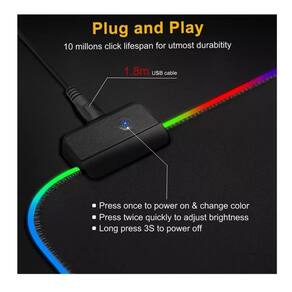 Mousepad Gamer Led Rgb Usb BLACK 80x30cm, o mousepad o acompanhará nas horas de jogo, oferecendo a precisão necessária ao mover o mouse sobre ele. Seu tamanho XL permite que você coloque, sem problemas, o mouse e o teclado, sendo antiderrapante em sua base (Superfície Ultra Suave). Esqueça os mousepad que se movem enquanto você joga, não é só para jogar, pois sua ergonomia permite que você trabalhe confortavelmente. É feito com fibra ultrafina. Iluminação LED exclusiva, este mousepad tem 10 tipos de luz monocromática, criando um ambiente de jogo agradável por meio da seleção do modo de cores. Plug and Play por cabo USB (interno), sem necessidade de driver, os modos de LED podem ser facilmente alterados com o clique no botão. É um complemento muito bom para sua mesa de computador ou mesa de jogos. -Projetado por jogadores, ideal para jogar/trabalhar no escritório. -Espessura = 4 mm - Baixo atrito: superfície lisa para controle rápido e antiderrapante da base de borracha. -Otimizado para vários mouses e sensores de sensibilidade. -Luzes RGB: 14 modos de iluminação: inclui 7 tipos de luz monocromática, 1 tipo de RGB alternado, 2 tipos de respiração RGB, 3 tipos de operação RGB - Seu tamanho XL permite que você coloque o mouse e o teclado sem problemas. - É antiderrapante por baixo e permite deslizar suavemente por cima. -Medidas: 80x30x0, 4 cm