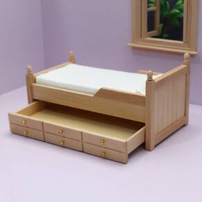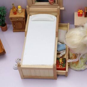 Dimensões: Comprimento 17,2 x largura 8,9 x altura 8,6 cm Altura da cama do chão 6,4 cm Material: madeira Peso: 210 g Design clássico de madeira: cama individual em miniatura com gavetas embutidas e colchão branco macio, adicionando funcionalidade e estilo às configurações dos quartos de uma casa de bonecas. Artesanato de qualidade: feita de madeira durável com acabamento natural, esta cama apresenta pequenas maçanetas douradas e detalhes realistas para uma aparência autêntica. Tamanho ideal para escala 1:12: projetado para minicasas e casas de bonecas em escala 1:12, tornando-o um complemento perfeito para qualquer ambiente de quarto ou teatro. Aviso importante: Este produto é um modelo de brinquedo e não para uso na vida real. Brinquedo não infantil — evite riscos de asfixia ou ferimentos. Incentiva a imaginação: ótimo para fingir e interpretar papéis, ajudando as crianças a criarem o quarto de casa de bonecas dos seus sonhos com opções funcionais de armazenamento.