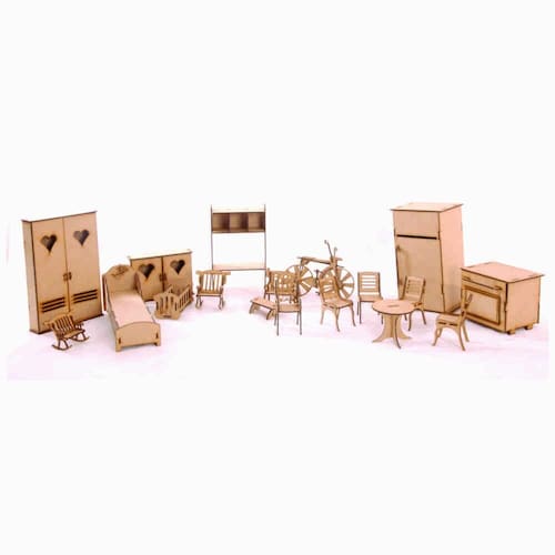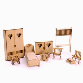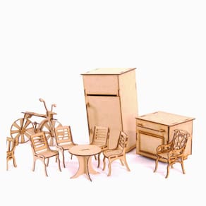 Confeccionado em mdf de 3 mm, o kit de móveis é composto pordiversas peças, as quais se encaixam sutilmente devido a precisão de corte dosmesmos. Não acompanha casinha.