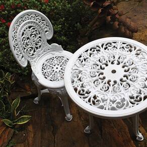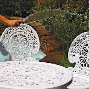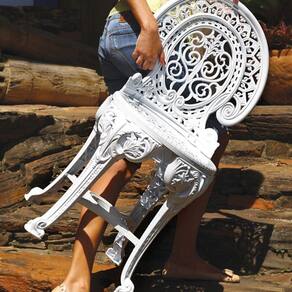 No estilo colonial, a cadeira lembra os tradicionais móveis de ferro, porém com as praticidades do plástico.
