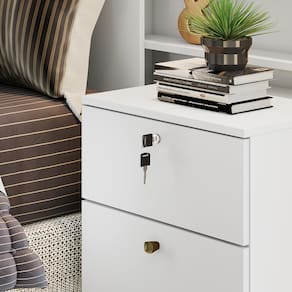 As mesas laterais possuem duas gavetas com corrediças telescópicas para abertura suave e puxadores modernos na cor bronze, muito mais resistentes. Possui 02 gavetas com chaves. Para completar, um nicho externo com espaço para objetos ao seu alcance.