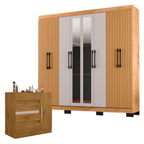 Cômoda 8000 e Guarda Roupa Casal B2348 Ripado Freijó Baunilha com Espelho - Araplac