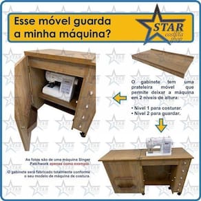 Móvel Gabinete Mesa Luxo Para Maquina Costura Brother Cs6000I Produto direto da fábrica Gabinete luxo com gaveteiro para máquina de costura doméstica O gaveteiro é o nosso modelo mais completo, com 5 gavetas, é um móvel muito bonito e espaçoso. Para quem quer deixar todas suas ferramentas, linhas, agulhas, tesouras, fita métrica, enfim, tudo bem organizado em um único local, o gaveteiro seria o móvel mais indicado. Esse móvel serve para máquinas de costura singer, elgin, vigorelli pretinha, verdinha, vermelha e muitas outras marcas. Todas as máquinas antigas com medidas de 37x18cm que tenham os dois furos na parte de trás para encaixe das dobradiças vão servir nesse móvel. Material: 100% mdf de 15mm de espessura. Mesmo material de móveis planejados de alto padrão. Cor: exatamente igual das fotos deste anúncio. Medidas: Largura: 45cm Altura: 76cm Comprimento móvel fechado: 69cm / comprimento móvel aberto: 123cm Abertura da máquina: 42,5x18cm Largura interna espaço para as pernas : 49,5cm Itens inclusos: - gaveteiro luxo completo o produto vai desmontado ; - manual de montagem passo a passo detalhado; - kit de rodinhas com trava; - porta cone de linha exclusivo ; - mini catálogo com cupom de desconto para próxima compra. Marca: Star Costura Ean: 7808887622451