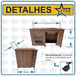 Móvel Gabinete Mesa Luxo Para Maquina De Costura Singer M1605 Produto direto da fábrica Gabinete luxo com gaveteiro para máquina de costura doméstica O gaveteiro é o nosso modelo mais completo, com 5 gavetas, é um móvel muito bonito e espaçoso. Para quem quer deixar todas suas ferramentas, linhas, agulhas, tesouras, fita métrica, enfim, tudo bem organizado em um único local, o gaveteiro seria o móvel mais indicado. Esse móvel serve apenas para a máquina especificada no título e fotos desse anúncio. Material: 100% mdf de 15mm de espessura. Mesmo material de móveis planejados de alto padrão. Cor: exatamente igual das fotos deste anúncio. Medidas: Largura: 43cm Altura: 77cm Comprimento móvel fechado: 69cm / comprimento móvel aberto: 123cm Abertura da máquina: conforme modelo da máquina descrita nesse anúncio. Largura interna espaço para as pernas : 49,5cm Itens inclusos: - gaveteiro luxo completo o produto vai desmontado ; - manual de montagem passo a passo detalhado; - kit de rodinhas com trava; - porta cone de linha exclusivo - star costura; - mini catálogo - star costura - com cupom de desconto para próxima compra. Marca: Star Costura Ean: 7793671666998