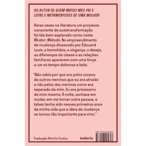 Ao retomar a ideia de transformação, que neste livro é desenvolvida até seu ponto máximo, Édouard Louis dá continuidade ao projeto que o alçou como um dos grandes nomes da literatura contemporânea. Dotado de uma voz sensível e cortante, em Mudar: Método o autor narra o processo de amadurecimento de Eddy Bellegueule, nascido na classe operária de uma pequena cidade no norte da França, até se transformar, ativamente, didaticamente, em Édouard Louis, escritor de sucesso internacional. A mudança empreendida por Louis é aqui desfiada com a mesma crueza a que os leitores de Quem matou meu pai e Lutas e metamorfoses de uma mulher já estão habituados. Para escapar da pobreza, da homofobia e dos muitos espectros de violência que rodeiam seu meio de origem, o narrador se agarra aos estudos como forma de se libertar de um futuro nas fábricas, destino de seu pai e de gerações de homens de sua família. Durante o percurso, somos apresentados aos acontecimentos de sua infância e juventude, acompanhando de que maneira a distância entre Eddy/Édouard e sua família e amigos se faz cada vez mais presente. É por meio desse exame da própria trajetória que Louis pode enfim repassar as relações familiares e sociais, pautadas pelo dinheiro e pelo poder, até a descoberta da homossexualidade e as discriminações que marcariam sua vida para sempre.