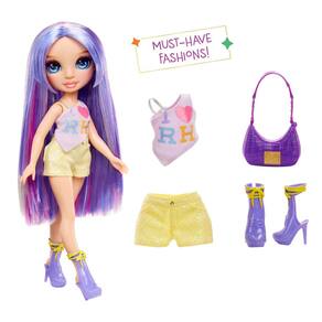 Muñeca Rainbow High Mi Estilo Fashion Violet, púrpura de 11" con conjunto llamativo, bolso elegante, magnífico regalo de juguete para niñas de 4 a 12 años. - ESTILO ÚNICO: En Rainbow High, cada una tiene su estilo único. Violet hace una declaración segura con su top púrpura "I Love RH", combinado con shorts iridiscentes con colores del arcoíris, tacones llamativos y un bolso púrpura de lujo que completa su look a la perfección. - DETALLES DESTACADOS: Violet está vestida completamente de púrpura, con cabello largo púrpura para peinar, pestañas largas delicadas y ojos de vidrio cautivadores. - POSABILIDAD PARA INSPIRAR EL JUEGO: Gracias a su articulación, es divertida para jugar. Puede girar la cabeza, mover brazos y piernas, y colocarse de pie o sentada: perfecta para escenas en el aula, compras y aventuras infinitas de historias. - REGALO PERFECTO PARA CUALQUIER OCASIÓN: El paquete es un regalo maravilloso para cualquier época del año. - INCLUYE: Muñeca de moda de 11", conjunto a la moda, zapatos y bolso. - MEZCLA Y COMBINA EL ARCOÍRIS: Colecciónalas todas para combinar sus atuendos: Bella, Sunny, Violet y Amaya. - MIRA EN YOUTUBE Y NETFLIX: Ve los nuevos episodios de la serie animada con las Littles en YouTube y comienza desde el principio en Netflix buscando "Rainbow High".