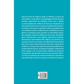 Este livro trata de mulheres, todas as mulheres, na aurora da maturidade. A psicanalista e psicopedagoga Mônica Donetto Guedes, organizadora da coletânea, trouxe para o debate as preocupações das mulheres de hoje que ultrapassaram a marca dos quarenta anos. E que preocupações são essas? Entre tantas, e sem querer responder a todas, aqui estão textos com temáticas sobre o envelhecimento, a vida afetiva e sexual, gênero e orientação sexual, gravidez na maturidade, depressão, questões corporais, profissionais, hormonais, dermatológicas, vida financeira, moral religiosa, saúde física e psíquica, adoecimento, maternidade tardia, violência, luto, divórcio, menopausa, transtornos mentais, o envelhecimento dos próprios pais, entre outros. Esses temas são vistos sob o prisma de 32 mulheres e 2 homens das mais diversas áreas profissionais e conhecimentos teóricos. As leitoras (e também os leitores) só terão a ganhar com os textos desta coletânea ao buscarem compreender duas grandes premissas que permeiam este livro: Por que mulheres não nascem prontas? E por que elas se reinventam após os 40? Com a palavra, as autoras e os autores.