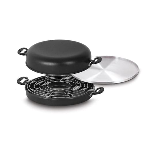 Churrasqueira confeccionada em alumínio com revestimento antiaderente, fabricada pela Indústria de Alumínios Eirilar. Especialmente desenvolvida para ser levada ao fogão, através de uma abertura em sua base recebe o calor e o distribui uniformemente sobre todo o alimento disposto sobre sua grelha. A base da churrasqueira dispõe ainda de um reservatório que deverá ser preenchido com água, cujo vapor garantirá a maciez dos alimentos, evitando seu ressecamento e inibindo a fumaça proveniente das gorduras. Ideal, portanto, para uso dentro de sua cozinha, mesmo que não haja exaustor. Pelo seu design e praticidade, poderá ainda ser levada à mesa para servir seus convidados.