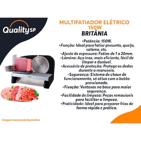 Multifatiador elétrico com lâmina de aço inox, ajuste de espessura de 1 a 20mm, bandeja coletora, sistema de segurança com chave de funcionamento, ventosas na base e porta-cordão.Vendido por VAREJO DIGITAL LTDA e entregue por Casas Bahia