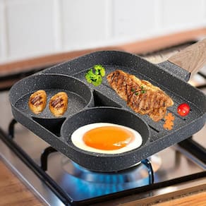 As frigideiras antiaderentes com 3 repartições são projetadas para fornecer maior versatilidade ao cozinhar alimentos, especialmente ao preparar várias porções ou diferentes ingredientes simultaneamente. Aqui estão alguns dos benefícios de usar uma frigideira antiaderente com 3 repartições para fritar ovos e outros alimentos:1.Economia de tempo e espaço: Com três repartições em uma única frigideira, você pode cozinhar três porções separadas de ovos ou outros alimentos ao mesmo tempo. Isso economiza tempo, pois você não precisa cozinhar em várias panelas diferentes, e também economiza espaço na sua bancada ou fogão.2.Cozimento uniforme: As frigideiras antiaderentes são conhecidas por distribuir o calor de forma mais uniforme, evitando pontos quentes que podem queimar os alimentos. Com três repartições, você pode ter a certeza de que cada porção de ovos ou outros alimentos será cozida de forma consistente.3.Fácil de limpar: As frigideiras antiaderentes são mais fáceis de limpar em comparação com frigideiras comuns4.Menor quantidade de óleo ou gordura: Como a superfície antiaderente evita que os alimentos grudem, você pode cozinhar com menos óleo ou gordura, tornando suas refeições mais saudáveis.5.Versatilidade: Além de fritar ovos, as frigideiras com várias repartições são ótimas para cozinhar outras receitas que requerem a separação de ingredientes ou para preparar porções individuais de diversos alimentos, como panquecas, mini omeletes, hambúrgueres, legumes e muito mais.