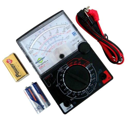 Multímetro analógico com sinal sonoro de continuidade, utilizado na bancada de trabalho (laboratório) ou em serviços de campo, incorpora diversos instrumentos de medidas elétricas em um único aparelho. Marca: brasfort Características: -Tensão contínua (dcv). 0,1v, 0,5v, 2,5v, 10v, 50v, 250v, e 1.000v. -Tensão alternada (acv): 10v, 50v, 250v e 1.000v. -Corrente contínua (dcma): 50µ, 2,5ma, 25ma e 0.25a. -Resistor (¿): 1¿, 10¿, 100¿, 1k¿ e 10k¿. decibel (db): 10db a +50db. transistor (iceo): 0ma a 15ma. transistor (hfe): npn/pnp. -Requer 2 pilhas aa e 1 bateria 9v. Conteúdo: -1 Multímetro analógico com sinal sonoro de continuidade. -2 Pilhas aa. -1 Bateria 9v. -1 Cabo multiteste. -1 Manual de instrução. Aplicação: ideal para uso profissional, tem ampla utilização entre os técnicos em eletrônica e eletrotécnica, pois são os instrumentos mais usados na pesquisa de defeitos em aparelhos eletro eletrônicos. Código: 8521