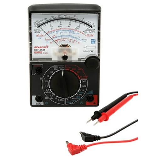 O multímetro é capaz de realizar a medição da corrente contínua, tensão alternada e contínua, resistência elétrica, polarização de transistor e teste de continuidade.