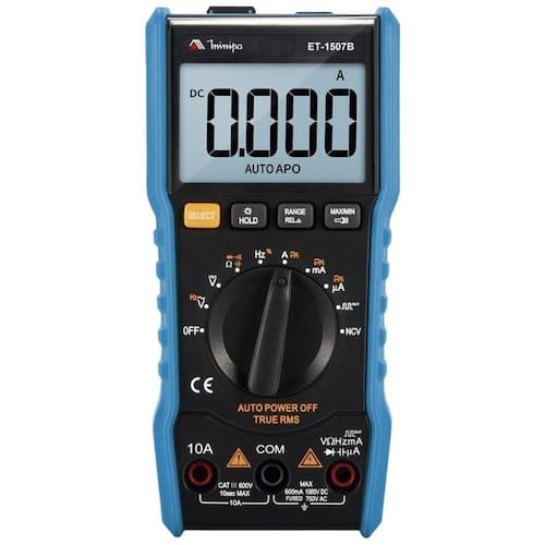 Multímetro Digital Cat Iii Et-1507b Este instrumento pode ser na medida de sinais de tensão DC/ AC True RMS, corrente DC/AC True RMS, resistência, capacitância, frequência de rede, duty cycle, detecção de tensão sem (NCV), testes de diodo e continuidade e gerador de ondas quadradas. Display: LCD 3 5/6 Dígitos, 6000 Contagens; Taxa de Amostragem: Aprox. 3 vezes/segundo; Indicação de idade: Automática; Indicação de Sobrefaixa: OL é mostrado; Indicação de Bateria Fraca: O símbolo + será mostrado quando a tensão da bateria cair abaixo da tensão de operação; Mudança de Faixa: Automática/ Manual; Data Hold; Blacklight; Lanterna; Função NCV; Modo relativo; Auto Power Off: Aprox. 15 minutos; Altitude de Operação: abaixo de 2000m; Temperatura de Operação: 0C a 40C, (32F a 104F); Temperatura de Armazenamento: 0C a 50C, (32F a 122F); Umidade Relativa: 80%; /Conformidade: IEC/EN 61010-1, Dupla Isolação, CAT III 600V; Grau de poluição: 2; True RMS AC; Alimentação: Duas Pilhas AAA 1,5V; Dimensões: 142(A) x 70(L) x 32(P)mm; Peso: Aprox. 205g (incluindo baterias);