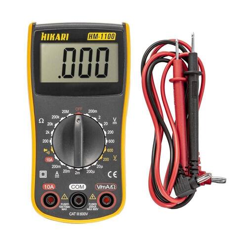Multímetro Digital Catiii 600v Hikari Hm-1100 21n138 Multímetro Digital CATIII 600V Hikari HM-1100 21N138 - Multímetro Digital CATIII 600V Hikari HM-1100 21N138 Características Gerais do Produto: - Modelo: HM-1100 - Marca: Hikari - Alimentação: 1 x 9V (Bateria NEDA 1604 ou 6F22ou 006P) - Especificações: Contagem Máxima do Display: 2000 contagens (3 Dígitos); Taxa de Amostragem: aproximadamente 3 vezes por segundo - Dimensões: 145(A) x 85(L) x 30(P)mm - Mudança de Faixa: Manual - Categoria de Segurança: IEC/EM 61010-1 Sobretensão e Dupla Isolação, CAT III 600V - Corrente DC: 20/ 200/ 2m/ 20m/ 200m e 10A - Tensão AC: 200 e 600V - Teste de Continuidade/Diodo: Sim - Tensão DC: 200m/ 2/ 20/ 200V e 600V - Resistência: 200/ 2k/ 20k/ 200k e 20M? - Características: Ambiente de Operação: 0C a 40C, RHPeso: Aproximadamente 170g (incluindo bateria) - Garantia direto com o Fabricante: 1 Ano (12 meses) Garantia: - 1 ano de garantia direto com o fabricante
