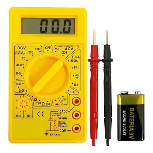Multímetro digital dt830b le-1945 portátil + bateria 9v inclusa dentro do produto Não possui bip sonoro. Especificações - display: 3 dígitos 2000 contagens . - indicação de sobre-faixa: mostra apenas o dígito mais significativo 1 . - temperatura de operação: 0c a 50c, rh 70%. - temperatura de armazenamento: -20c a 60c, rh 80%. - uso interno. - alimentação: 1 x 9v inclusa - dimensões: 126 a x 70 l x 24 p mm. - peso: aproximadamente 150g. Tensão dc: - faixas: 200mv, 2000mv, 20v, 200v, 1000v - resolução: 100v, 1mv, 10mv, 100mv, 1v - precisão garantida: 200mv 0.25% 2d ; 2000mv 1000v 0.5% 2d - impedância de entrada: 1mw - proteção de sobrecarga: 220v ac rms para faixa 200mv; 1000v dc / 750v ac rms para outras faixas. Tensão ac: - faixas: 200v, 750v - resolução: 100mv, 1v - precisão: 200v 750v 1.2% 10d - impedância de entrada: 1mw - resposta em frequência: 45hz a 450hz - proteção de sobrecarga: 1000v dc / 750v ac rms Corrente dc: - faixas: 200a, 2000a, 20ma, 200ma, 10a - resolução: 0.1a, 1a, 10a, 100a, 10ma - precisão: 200a 20ma 1% 2d ; 200ma 1.2% 2d ; 10a 2.0% 4d . - proteção de sobrecarga: fusível de ação rápida 0.2a/250v para entrada ma; sem fusível para entrada 10a 10a máximo por 15 segundos . Resistência: - faixas: 200w, 2000w, 20kw, 200kw, 2000kw - resolução: 0.1w, 1w, 10w, 100w, 1kw - precisão: 200w 200kw 0.8% 2d ; 2000kw 1.0% 2d - tensão de circuito aberto: 2.8v dc máximo - proteção de sobrecarga: 220v rms máximo 10s Diodo: - faixa: diodo - indicação: queda de tensão aproximada sobre o diodo - condição de teste: corrente direta aproximada de 1ma dc - tensão reversa aproximada de 2.8v dc - proteção de sobrecarga: 220v rms máximo 10 segundos Teste de hfe de transistor: - faixa: 0 1000 - ib: 10a - vce: 2.8v dc Dados técnicos - dimensões: 126 a x 70 l x 24 p mm. - peso: aproximadamente 150g. Itens incluso: 1 multímetro digital 1 par ponta de teste 1 bateria 9v 1 manual em inglês do vendedor: 3 meses