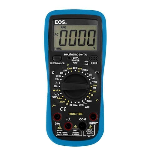 O Multímetro digital EOS EMD01 é compacto, leve e completo, sendo uma ferramenta ideal para todas as caixas de ferramentas. Com funções para medição de tensão, corrente contínua e alternada, resistência, continuidade, diodos, capacitância, transistor e temperatura, o multímetro EOS fornece a solução completa para as mais variadas necessidades de medições e verificações das grandezas elétricas.