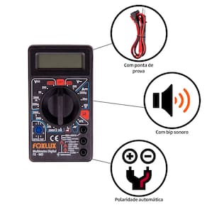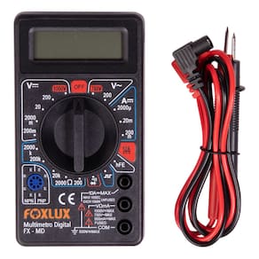 O Multímetro Digital Foxlux é uma ferramenta essencial para a medição de correntes, tensão, resistência, continuidade e teste de transistores. Este equipamento de alta precisão vem acompanhado de ponta de prova, bateria e possui um fusível interno na entrada do circuito, garantindo proteção extra e aumentando a durabilidade do produto.