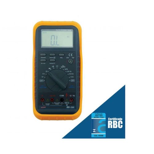 MULTÍMETRO DIGITAL MOD.MD-390 3/4 DÍGITOS PARA TENSÃO, CORRENTE, RESISTÊNCIA, CAPACITÂNCIA, DIODO, FREQUÊNCIA E TRANSISTOR (HFE) COM CERTIFICADO DE CALIBRAÇÂO ACREDITADA RBC DESCRIÇÂO: Este multímetro é um instrumento de medição profissional com escala automática e display de cristal líquido de 3 ¾ dígitos, capaz de executar as seguintes funções: APLICAÇÔES: Medição de tensão contínua (DC) e alternada (AC) Medição de corrente contínua (DC) e alternada (AC) Medição de resistência Medição de capacitância Medição de freqüência Teste de transistor e diodo Teste de continuidade audível INFORMAÇÕES DE SEGURANÇA: Este multímetro foi projetado de acordo com as normas IEC-1010 relativas à instrumentos de medição eletrônicos com categoria de sobre tensão (CAT II) poluição 2. DESCRIÇÃO CERTIFICADO DE CALIBRAÇÃO: Certificado de Calibração RBC P/ Multímetro em Resistência, Corrente AC/DC e Tensão AC/DC sob os Procedimentos PCI-022/039/040/014 em Pontos bem Distribuídos Pelas Faixas de Medição Calibração acreditada RBC Procedência: Laboratório de Calibração Instrutherm ESPECIFICAÇÕES TÉCNICAS: Escalas: Tensão DC: 400mV, 4V, 40V, 400V, 1000V Exatidão: ± (0,5% ±4) Tensão AC: 400mV, 4V, 40V, 400V, 750V Exatidão: ± (0,8% ±6) Corrente DC: 400µA, 4mA, 40mA, 200mA, 10A Exatidão: ± (1,0% ±8) Corrente AC: 400µA, 4mA, 40mA, 200mA, 10A Exatidão: ± (1,5% ±8) Resistência: 400¿, 4k¿, 40k¿, 400k¿, 4M¿, 40M¿ Exatidão: ± (0,8% ±1) Capacitância: 4nF, 40nF, 400nF, 4mF, 40mF, 200mF Exatidão: ± (5,0% ±3) Freqüência: 40Hz, 400Hz, 4kHz, 40kHz, 400kHz, 4MHz, 30MHz Exatidão: ± (1,2% ±3) Display de Cristal Líquido de 4 dígitos Categoria de Segurança: CAT-II 1000V Função Duty Cicle % Teste de transistor Teste de diodo Continuidade audível Data-hold Desligamento automático Escala automática Alimentação: 2 pilhas AA de 1,5V Dimensões: Aprox. 91 x 189 x 32 mm Peso: 280g ACESSÓRIOS FORNECIDOS: Pontas de Prova 2 Pilhas de 1,5V Holster Manual de Instruções Certificado de calibração