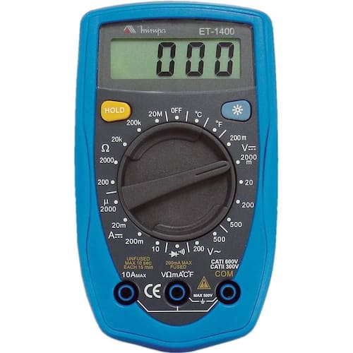 Display LCD/Contagem 3 1/2 Dígitos/2000 Iluminação/Barra Gráfica Iluminaca~o True RMS - Tensão DC 200m/2000m/20/200/500V Tensão AC 200/500V Tensão de Isolamento - Corrente DC 2000?/20m/200m/10A Corrente AC - Resistência 200/2000/20k/200k/20M? Resistência de Isolamento - Temperatura -40~+1000C/-40~+1832F Capacitância - Condutância - Indutância - Frequência - Frequência de Rede - Duty Cycle/Largura de Pulso - Função VFD - Leit. %4-20mA Loop - Saída %4-20mA Loop - Teste de Continuidade/Diodo - Detecção de Tensão Sem Contato (NCV) - Detecção de Tensão Sem Contato com Nível (EF) - Saída de Onda Quadrada - Saída de Tensão - Decibel - Teste hFE - Teste Linha Viva - Teste de Bateria - Teste Lógico - Auto Check ACV/DCV/? - Mudança de Faixa Manual Memória - Interface e Software - Data Logger - Autodesligamento/Beep Guard - Seleção Função - Máx./Mín./Méd./Relativo - Data/Peak Hold Data Hold Auto Range - Limite Hi/Lo (Acima/Abaixo) - Indicação de Bateria Fraca - Precisão Básica 0,50% Holster Protetor Intercambiável - Categoria de Segurança CAT II 300V Alimentação 1x9V Dimensões (mm)/Peso (g) 130x73,5x35/156 Garantia 12 meses