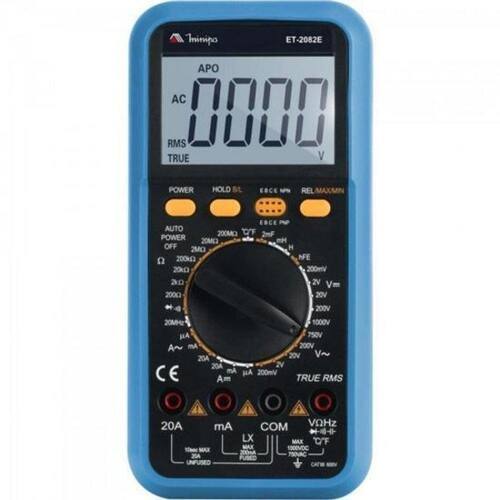 O multímetro digital modelo et-2082e da minipa possui display de 42mm de altura com iluminação de fundo (backlight) faz medidas de tensão dc / (ac rms), corrente dc / (ac rms), resistência, capacitância, temperatura, frequência e indutância, testes de diodo, continuidade e hfe de transistor. Como características adicionais apresenta as funções auto power off e indicador de bateria fraca.Display:3 1/2 dígitos/2000