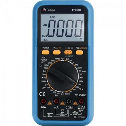 O multímetro digital modelo et-2082e da minipa possui display de 42mm de altura com iluminação de fundo (backlight) faz medidas de tensão dc / (ac rms), corrente dc / (ac rms), resistência, capacitância, temperatura, frequência e indutância, testes de diodo, continuidade e hfe de transistor. Como características adicionais apresenta as funções auto power off e indicador de bateria fraca.Display:3 1/2 dígitos/2000