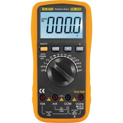 Multímetro Digital Hikari Hm-2090 Laranja/preto O Multímetro Digital Hikari HM-2090 é uma ferramenta versátil e confiável, ideal para medições precisas em circuitos eletrônicos, circuitos de ramificação, linhas de baixa tensão e aplicações industriais. Em conformidade com a IEC 61010-1, categoria de sobretensão CAT. IV 600V, este modelo oferece dupla isolação e vem com um holster protetor, garantindo segurança ao trabalhar em sistemas elétricos de baixa tensão. Além disso, este multímetro é equipado com um visor LCD de 3 dígitos com iluminação de fundo, facilitando a leitura dos resultados em qualquer condição de iluminação. Seus recursos incluem medidas de tensão DC e AC, corrente DC e AC, resistência, capacitância, frequência, Duty Cycle, temperatura e testes de diodo e continuidade.