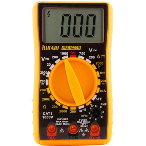 Multímetro Digital Hm-1002b Cat I 1000v O Multímetro Digital modelo HM-1002B, categoria de segurança CAT I 1000V, se destaca pelas medidas de Tensão DC/AC, Corrente DC, Resistência e pelos testes de Diodo e Continuidade. Como característica adicional apresenta as funções: Gerador de Onda Quadrada, Teste de hFE e Indicador de Bateria Fraca, além do seu amplo display de 2,3. O Multímetro Digital HM-1002B pode ser utilizado em bancadas para medir circuitos eletrônicos e ambientes monofásicos protegidos. Contagem Máxima do Display: 2000 contagens (3 Dígitos); Display Grande: Fácil visualização 2.3. Taxa de Amostragem: aproximadamente 2 vezes por segundo; Indicação de Polaridade: Automática; Indicação de Sobrefaixa: é mostrado no display; Indicação de bateria fraca: Símbolo é mostrado no display; Mudança de Faixa: Manual; Teste de Continuidade, Diodo, hFE de Transistor; Gerador de Onda Quadrada de 50 Hz; Tensão de Saída: Aproximadamente: 5Vpp; Impedância: Aproximadamente: 50 kO. Altitude de Operação: 2000m Ambiente de Operação: 0C a 40C, RH<80%; Ambiente de Armazenamento: -10C a 60C, RH<70%; Segurança / Conformidade: IEC/EM 61010-1 Sobretensão e Dupla Isolação, CAT I 1000V; Grau de poluição: 2; Proteção por Fusível de 500mA/250V para o Terminal de Entrada mA PPTC fusível de Auto Restauração; Tipo de Alimentação: 1 x 9V (Bateria NEDA 1604 ou 6F22ou 006P); Mais informações Segurança / Conformidade: IEC/EM 61010-1 Sobretensão e Dupla Isolação, CAT I 1000V; Grau de poluição: 2; Proteção por Fusível de 500mA/250V para o Terminal de Entrada mA PPTC fusível de Auto Restauração; Tipo de Alimentação: 1 x 9V (Bateria NEDA 1604 ou 6F22ou 006P); Ean: 7899810415615