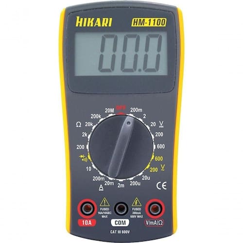 Multímetro Digital Hm-1100 Realiza medidas de tensão DC e AC, corrente DC , resistência e testes de diodo e continuidade. Display LCD / Contagens: 3 Dígitos / 2000 contagens Tensão DC: 200m/2/20/200/600V Tensão AC: 200/600V Corrente DC: 20/200/2m/20m/200m/10A Resistência: 200/2k/20k/200k/20MO Teste de Continuidade / Diodo: SIM Mudança de faixa: Manual Indicação de Bateria Fraca: SIM Precisão básica 0,5% Categora: CAT III 600V Dimensões: 145 x 85 x 30mm Peso: 170g Alimentação: Bateria 9V]]>