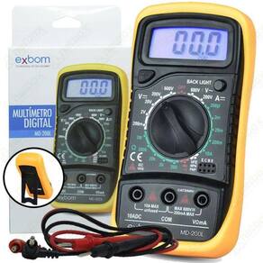 Produto: Novo Marca: Exbom Modelo: MD-200L Cor: Preto Capa emborrachada: Amarela Apoio de mesa: Sim Alimentação: Bateria 9V Consumo: Aprox. 3mA (típico) Display: 2000 Contagens Taxa de Amostragem: Aprox. 3 vezes/s Indicação de Sobre-faixa: Dígito mais significativo (1) Indicação de Bateria Fraca: O símbolo bateria aparece quando a tensão da bateria estiver abaixo da nominal para operação Desligamento Automático Após: Aprox. 20-10 minutos