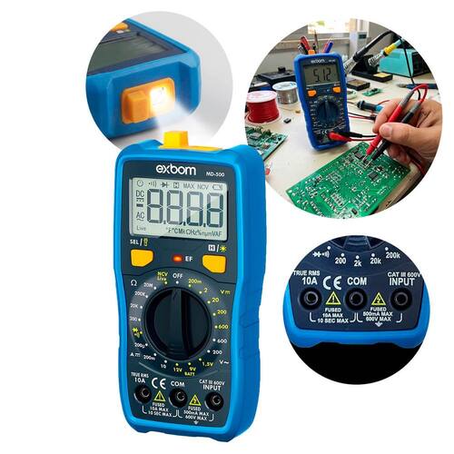 Descrição: O Multímetro Digital Profissional True RMS é a escolha ideal para quem busca precisão e segurança em medições de eletricidade. Com tecnologia avançada que permite medições confiáveis até mesmo em sinais distorcidos, este multímetro é perfeito para eletricistas, técnicos e uso doméstico. Com categoria de segurança CAT III 600V, ele oferece um display amplo, lanterna embutida e função de backlight, facilitando o trabalho em locais com pouca iluminação. As funcionalidades incluem teste de continuidade com bip, teste de diodo e bateria, além da função HOLD para retenção de leitura, garantindo praticidade e rapidez. Sua construção em ABS de alta resistência com capa emborrachada garante durabilidade e proteção, tornando-o um aliado indispensável no dia a dia. Com alerta de bateria fraca e proteção contra sobrecarga, você pode contar com ele em diversas aplicações, seja na sua casa ou em projetos profissionais. Informações Técnicas: