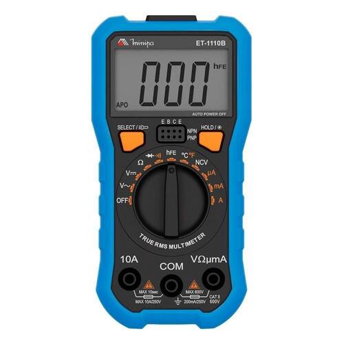 Multimetro Digital True Rms Et-1110b O modelo ET-1110B é um multímetro compacto, prático e de fácil manuseio.Ele faz medições de corrente AC/DC, tensões AC/DC, resistência, temperatura, teste de diodo, continuidade e hFE.Além das funções de desligamento automático, data HOLD e NCV. Display: 3 1/2 Dígitos, 2000 Contagens;Indicação de Polaridade: Automática;Mudança de Faixa: Automática;Indicação de Sobrefaixa: Indica OL no display;Taxa de Amostragem: Aprox. 3 vezes por segundo;Indicação de bateria fraca:Luz de Fundo e Lanterna;Data Hold;Medição de Temperatura;Função NCV;Teste de hFE;Desligamento Automático (APO 15 minutos / off);Ambiente de Operação: 0 a 40C, U.R.<80%;Armazenamento: -10 a 50C, U.R.<80%;Alimentação: 2 x 1,5V AAA;Autonomia: Aproximadamente 200 horas paraBateria alcalina e 100 horas para bateria de carbono;Conformidade: IEC61010 CAT II 600V; Marca: Não Informado Ean: 7908157100464