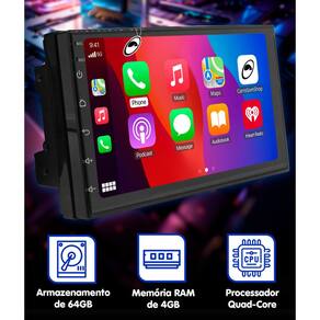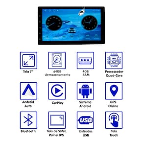 ESPECIFICAÇÕES TÉCNICAS: - Multimídia Full Touch 7"; - Processador: Quad-Score; - Memória RAM: 4 GB; - Armazenamento: 64 GB; - Sistema Android; - Tela de vidro; - Painel IPS; - Resolução de imagem: 1024x600; - Potência: 4x60W RMS; - Compatível com espelhamento; - 7 Opções de cores nos botões laterais; - Bluetooth - atende ligações e reproduz música; - 2 Entradas USB e Auxiliar; - Compatível com Carplay e Android Auto - conectividade sem fio; - 1 Entrada de vídeo; - 1 Entrada para câmera de ré; - 2 Fios SWC para comando de volante (grava até 10 funções); - 1 Entrada para microfone - 1 Saída de subwoofer;