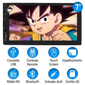 ESPECIFICAÇÕES TÉCNICAS: - Tela de 7" polegadas Touch Screen com resolução de 1024x600; - Sistema PAL / NTSC; - Compatível com RMVB, MPG4, DivX, AVI, MP3, MP4, MP5, MPEG, JPEG; - Troca de cores da luz do botões; - Conexões USB e Cartão SD; - Conexão com aparelhos celulares para ligações e músicas via Bluetooth; - Espelhamento Android (incompatível com celulares X1A.0M1); - Espelhamento IOS (as versões de iPhone suportadas variam entre os modelos 6 a 11 - normal - e XR. Incompatível com os modelos X, XS e 11 Pro; - Compatível MP3, MP5, WMA; - Rádio FM com 18 memórias; - Compatível com telas e câmeras; - Potência de saída 50W x 4; - Saídas RCA; - Controle remoto; - Entrada para câmeras de estacionamento traseira; - 2 saídas RCA.
