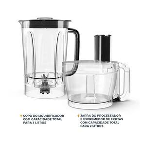 Possui acessórios que executam múltiplas funções: 01 Copo de liquidificador, 01 jarra de multiprocessador, 01 espremedor de frutas, 01 adaptador de lâminas, 01 lâmina de fatiar, 01 lâmina de ralar, 01 lâminas de processar