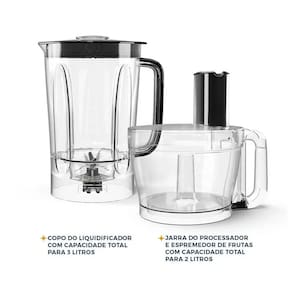 Possui acessórios que executam múltiplas funções: 01 Copo de liquidificador, 01 jarra de multiprocessador, 01 espremedor de frutas, 01 adaptador de lâminas, 01 lâmina de fatiar, 01 lâmina de ralar, 01 lâminas de processar