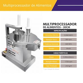 Características Técnicas do Multiprocessador de Alimentos IndustrialVoltagem: 127vMotor: 1/2 CV MonofásicoPotência: 360wConsumo: 0,37 kw/hRotação: 375 rpmProdução: 250kg/hModelo: MPAIProduto segue todas as normas e exigências do INMETRO.Medidas do Multiprocessador de Alimentos IndustrialAltura: 46,5cmLargura: 36cmProfundidade: 63,5cmPeso: 26 kgBocal Maior: 12,3cmBocal Menor: 4,8cmGarantia