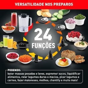 Com 24 funções, este multiprocessador reúne 7 eletrodomésticos em um único aparelho: processador, liquidificador, fatiador, emulsificador, espremedor de frutas e dois raladores. Isso significa que você terá mais economia de espaço e menos bagunça na sua cozinha, sem abrir mão de versatilidade e da eficiência.