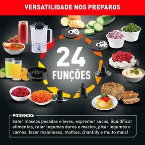 Com 24 funções, este multiprocessador reúne 7 eletrodomésticos em um único aparelho: processador, liquidificador, fatiador, emulsificador, espremedor de frutas e dois raladores. Isso significa que você terá mais economia de espaço e menos bagunça na sua cozinha, sem abrir mão de versatilidade e da eficiência.