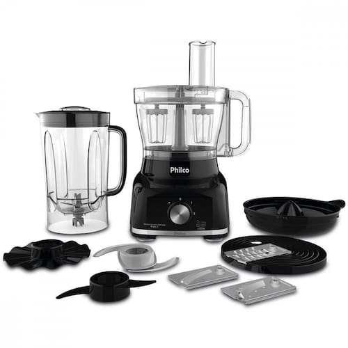 Multiprocessador Philco 9 em 1 com potência de 1700W, 2 velocidades + pulsar, jarra de 2,1L e copo de liquidificador de 3,2L (1,7L útil). Possui design vertical, pés antiderrapantes e trava de segurança.Acessórios