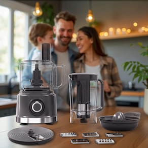 Multiprocessador Philco Multifunções 5 em 1 com 1000W de potência, funções de liquidificador, processador, fatiador, ralador e espremedor. Design moderno e robusto com jarras de alta capacidade e tampas dosadoras.Acessórios