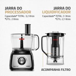 JARRA DO PROCESSADOR DE 3,2 LITROS: A capacidade útil é de 2 litros. O item é ideal para processar carnes, queijos, vegetais, grãos, temperos, entre outros.