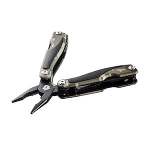 O cabo dessa multitool é antiderrapante e feito de óxido de alumínio com design camuflado, proporcionando segurança e conforto durante o uso. Além disso, ela possui múltiplas funções que vão te auxiliar no dia a dia, como alicate, faca afiada, abridor de garrafa, chave Philips, chave de fenda, faca serrilhada, abridor de lata, lixa áspera e régua.
