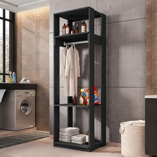 Produto com cabideiro de alumínio e prateleiras. Versátil e se adapta a vários ambientes.