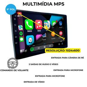 Multimídia mp5 Modelo: ht-9125ca Tela de vidro 9 pol slim Painel: ips Resolução de imagem: 1024x600 Potência: 4x60w rms Compatível com espelhamento, carplay e android auto conectividade com e sem fio consulte versões Rádio fm Bluetooth: ligação e reprodução de músicas 7 opções de cores nos botões laterais 2 entradas usb 1 saída de subwoofer 1 entrada de vídeo 1 entrada para câmera de ré 1 entrada para microfone 2 saídas de áudio e vídeo 2 fios swc para comando de volante grava até 10 funções