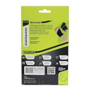 A munhequeira ajustável oferece compressão em torno do punho, melhorando a sensação de estabilidade da articulação. Essa compressão pode ser ajustada, conforme a necessidade, através da aba com fecho aderente de tiras aderentes. O orifício para o polegar proporciona mais segurança para a articulação e facilita o ajuste do produto. Retém o calor devido ao material em neoprene, mantendo a região aquecida, auxiliando no alívio da dor.7.6 Especificação: - Perfil: Apoio e Prevenção; - Material: Neoprene; - Cor: Preta; - do fabricante: Contra defeito de fabricação; -medida da Caixa: 7,5cmx4,5cmx2,5