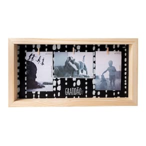 produzido em Pinus e HDF, possui três grapos para prender fotos Material: Pinus e HDF Contém: 1 Mural de fotos Dimensões: 46 x 24 x 5cm. cuidados: Limpar com pano seco. Não utilizar produtos químicos e abrasivos. Impactos e quedas podem danificar o produto.