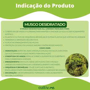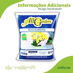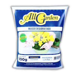 Características * Marca: All Garden; * Tipo: Musgo Sphagnum Desidratado; * Peso líquido: 100g; * Produto natural e ecológico; * Composição: Musgo desidratado; * Uso indicado: Jardinagem, kokedamas, cultivo de orquídeas, substrato para plantas