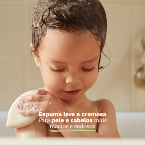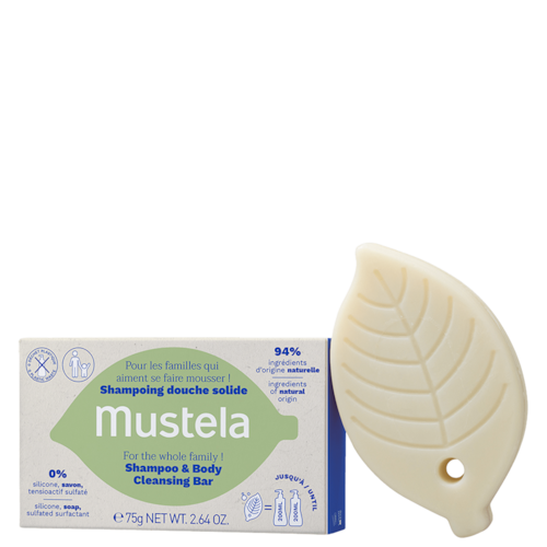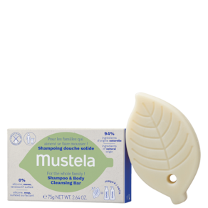 Shampoo sólido 2 em 1, para corpo e cabelo. Mustela Corpo e Cabelo traz maciez para a pele e brilho para o cabelo.